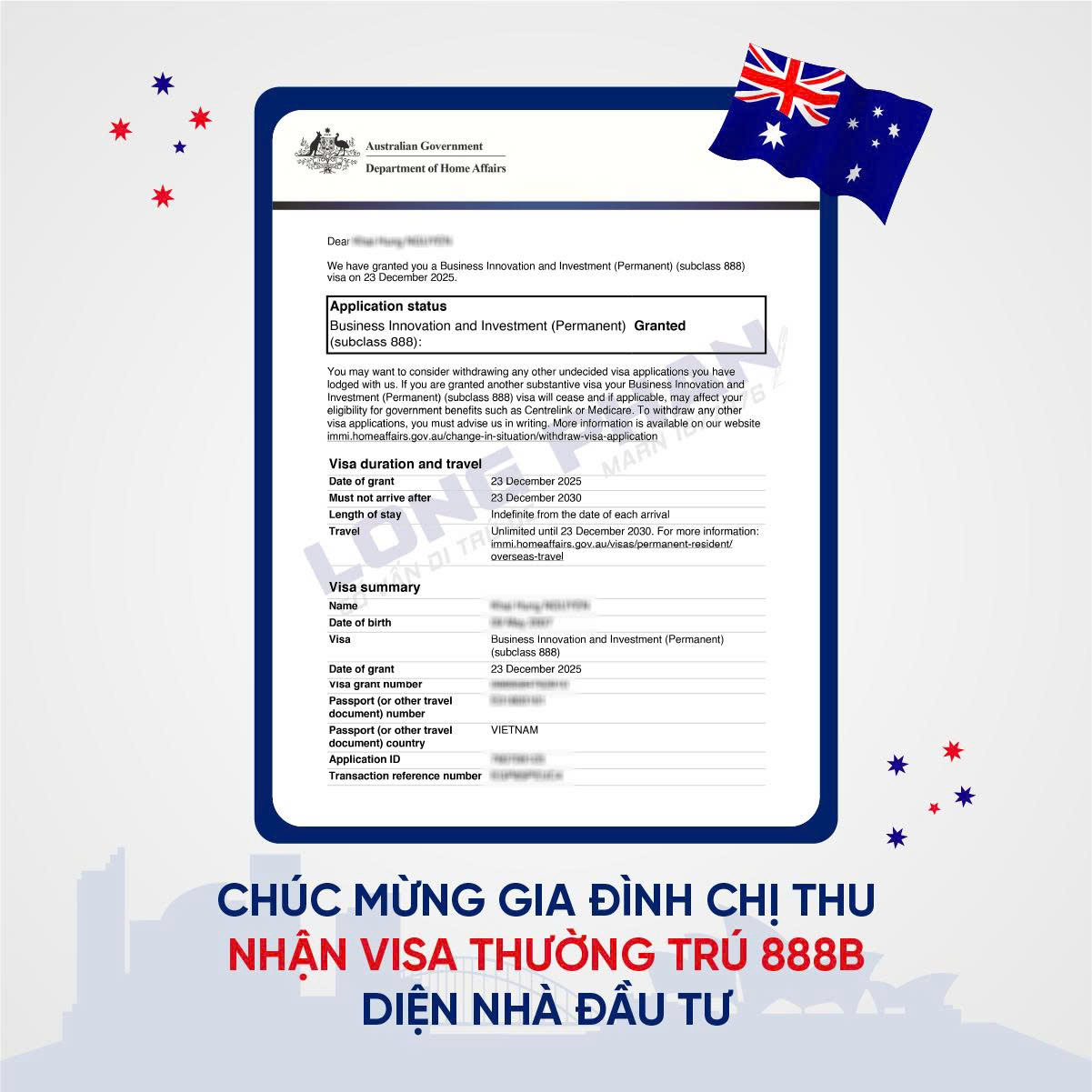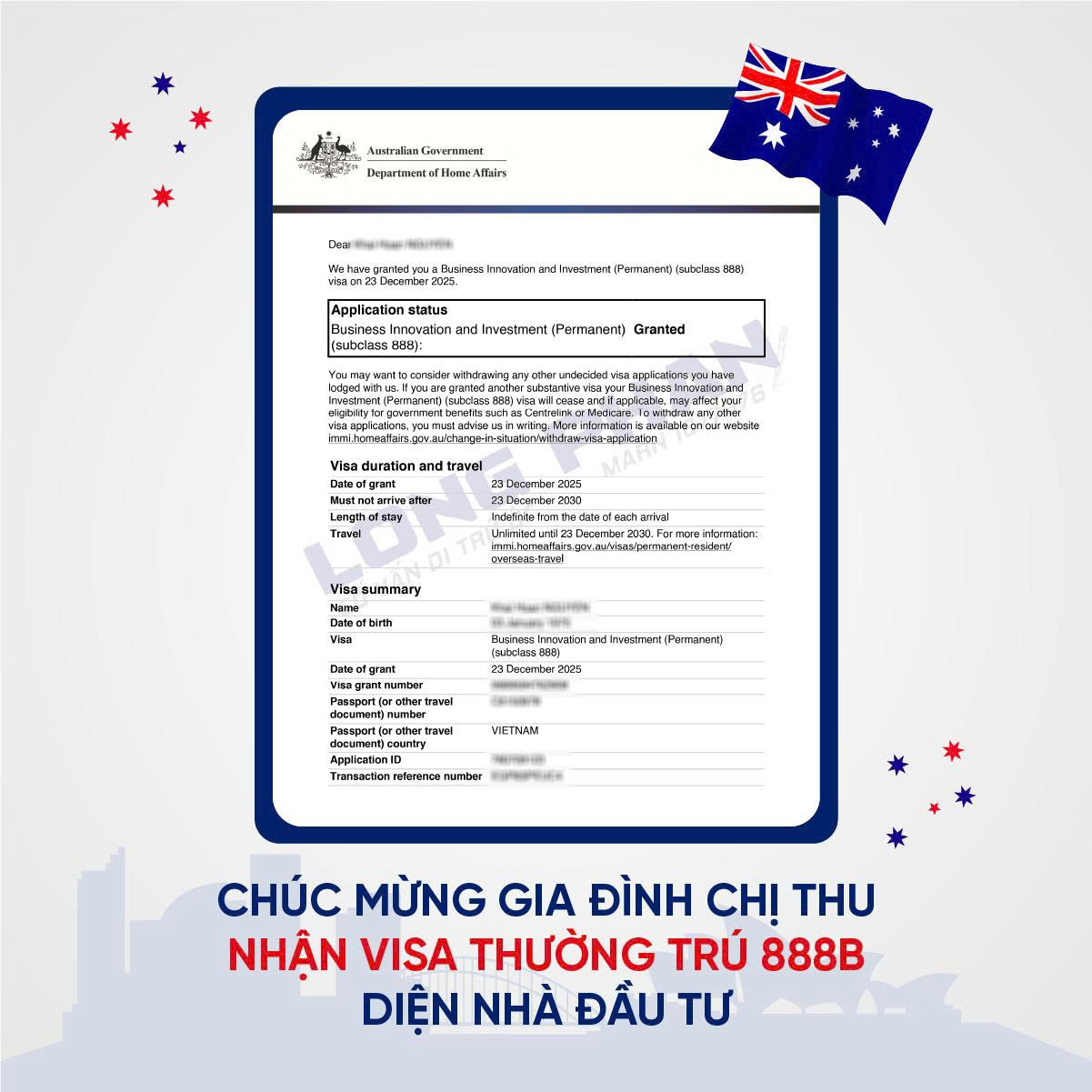 Ngay sau đó, hồ sơ tiếp tục được nộp lên Bộ Nội vụ Úc. Đầu tháng 11/2025, gia đình chị Thu chính thức có case officer, cùng yêu cầu bổ sung lý lịch tư pháp, khám sức khỏe và chứng minh trình độ tiếng Anh. Và rồi, chỉ chưa đầy hai tháng kể từ thời điểm có case officer, vào ngày 23/12/2025, món quà Giáng sinh ý nghĩa nhất đã đến - thông báo cấp visa Thường trú 888B cho cả gia đình.