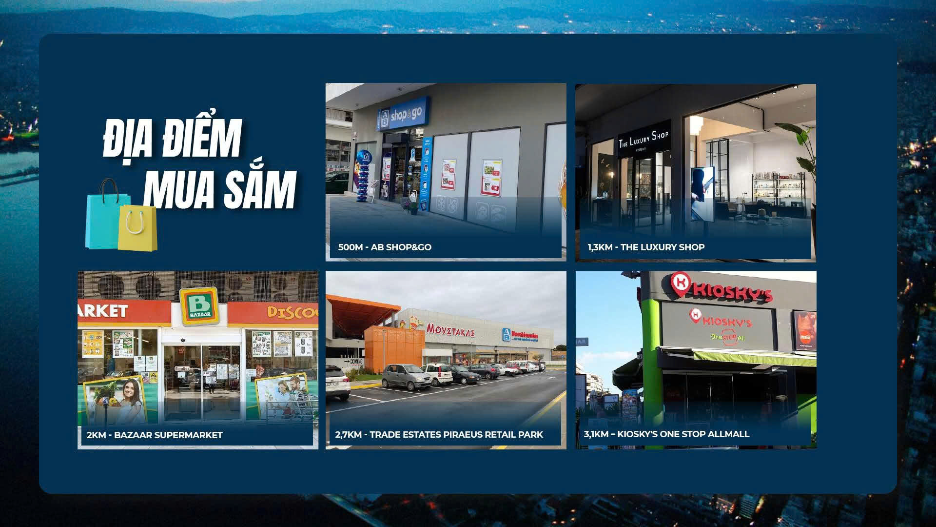 - Mua sắm & giải trí: Chỉ vài phút tới trung tâm thương mại Kallithea và các phố thương mại ven biển Alimos.